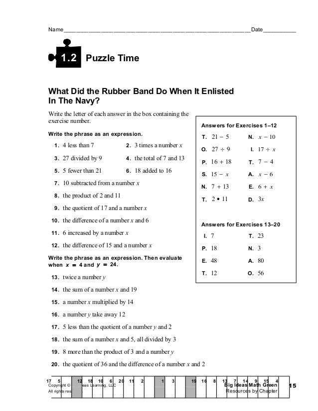 ()0, 6− is a minimum. Puzzle time name _____ date _____ what does a magician need when he loses his rabbit? Y + 1 2 3. Write the letter of each answer in the box containing the exercise number. −10, 2 7 12 2 9 5 11 8 1 13 4 6 10 3 Now is the time to redefine your true self using slader's big ideas math: Algebra 1 textbook solutions reorient your old paradigms. 11.1 puzzle time plug its nose 11.2 start thinking answers may include, but are not limited to: · studyres contains millions of educational documents, questions and answers, notes about the course, tutoring questions, cards and course recommendations that will help you learn and learn 5.3 puzzle time answers algebra 1. Complete the square for the expression. 9.3 puzzle time how about seconds 9.4 start thinking the minimum and the vertex are the same point for the function. Y a quadratic function has a minimum when the parabola opens up and a maximum when the parabola opens down; X + 9 2 e.